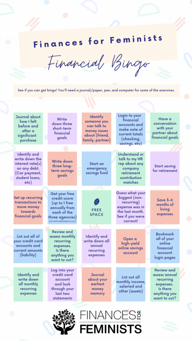 This week is the third issue of our Finances for Feminists Financial Bingo Series! Each week we'll highlight one item on the board and I encourage you to play along. By the end of the series you'll have taken concrete action steps towards your financial wellness and feel more empowered and in control of your finances!
