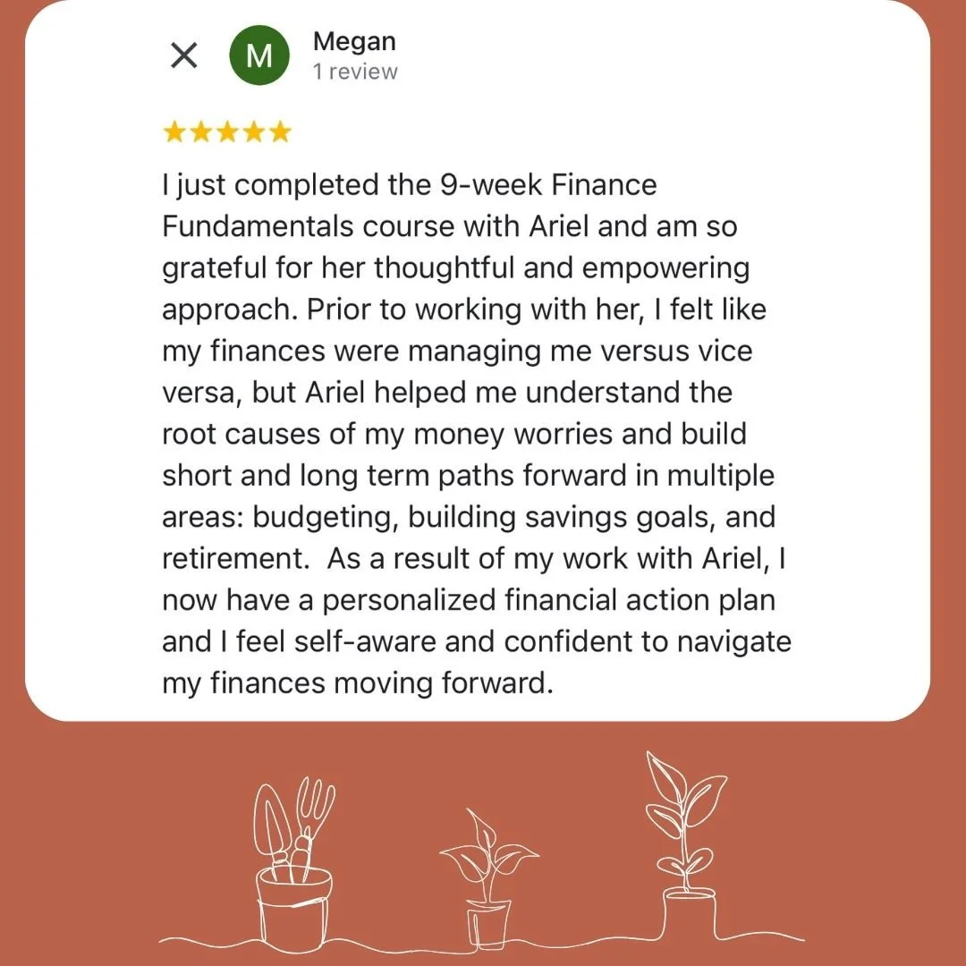 Finance Fundamentals is my 3 month one-on-one signature money coaching program for individuals and couples. It breaks down all that you need to know about personal finance with six easy modules. All with one-on-one personalized coaching, individualized support, and accountability.